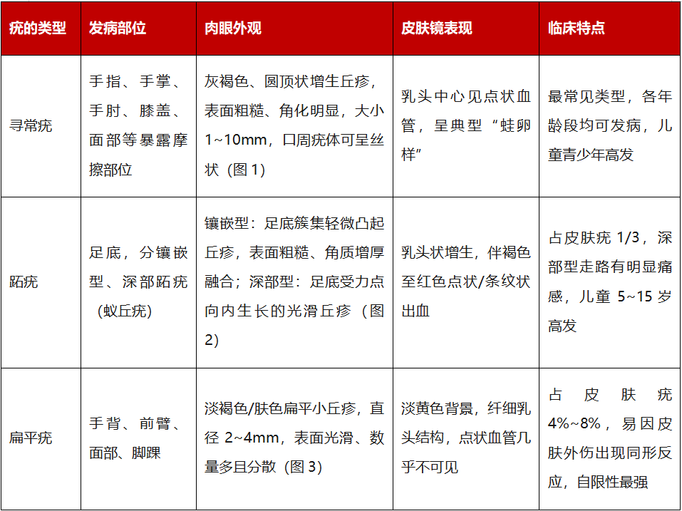临床上最常见的皮肤疣主要分为寻常疣、跖疣、扁平疣三类,各自在发病部位、外观表现、临床特点上差异显著,结合肉眼观察+皮肤镜检查能实现精准诊断,皮肤镜作为无创诊断工具,还能有效区分疣与鸡眼、老茧等易混淆病变。