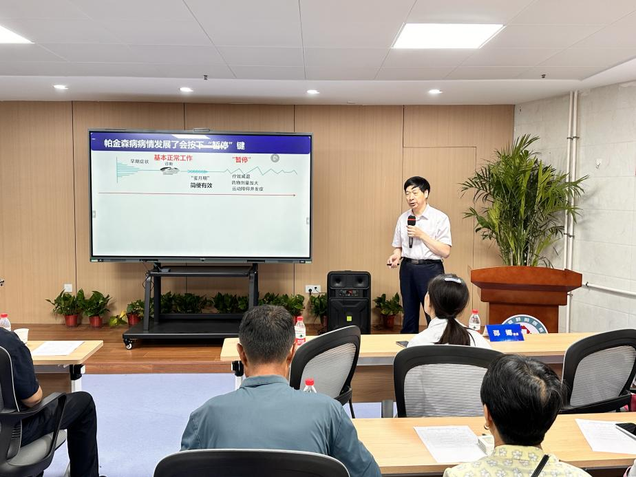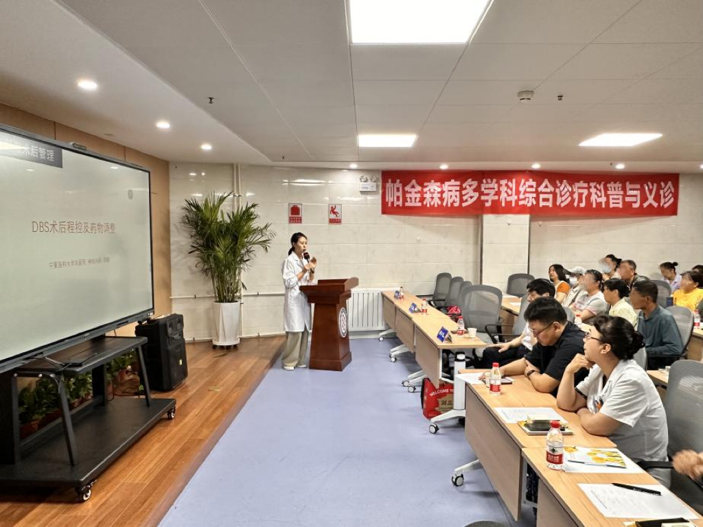 上海市第四人民医院神经外科胡小吾主任医师带来主题为《当大脑按下“暂停键”:DBS手术的解锁与重启》的精彩分享。他凭借深厚的专业知识与丰富的临床经验,以通俗易懂的语言,将DBS手术的原理和意义向在场听众娓娓道来。为了让大家更直观地感受DBS手术的疗效,胡教授特别邀请了一位接受DBS手术的患者及家属来到现场,并播放了患者手术前评估行动能力及表达能力的记录视频。视频中,该患者无法站立,只能依靠轮椅出行,甚至连大声念出自己的名字都十分困难;而在活动现场,这位患者不仅能够独立行走,还能与他人进行正常交流,并且轻松跟随护士完成康复操,这种显著的前后对比,让在场的患者和家属真切体会到了DBS手术的强大力量。随后,宁医大总院神经内科副主任医师邵娜围绕《术后护理—程控与调药须知》展开深入讲解,从术后护理的关键要点到程控调药的具体方法,为患者康复提供了切实可行的实用指导。