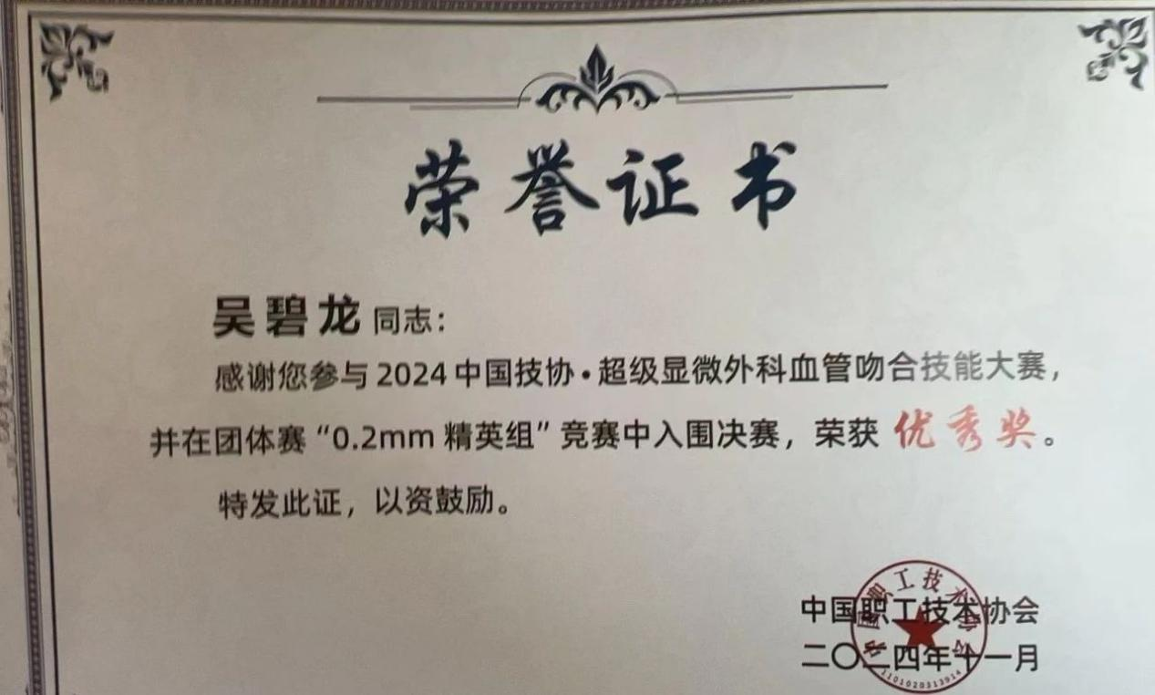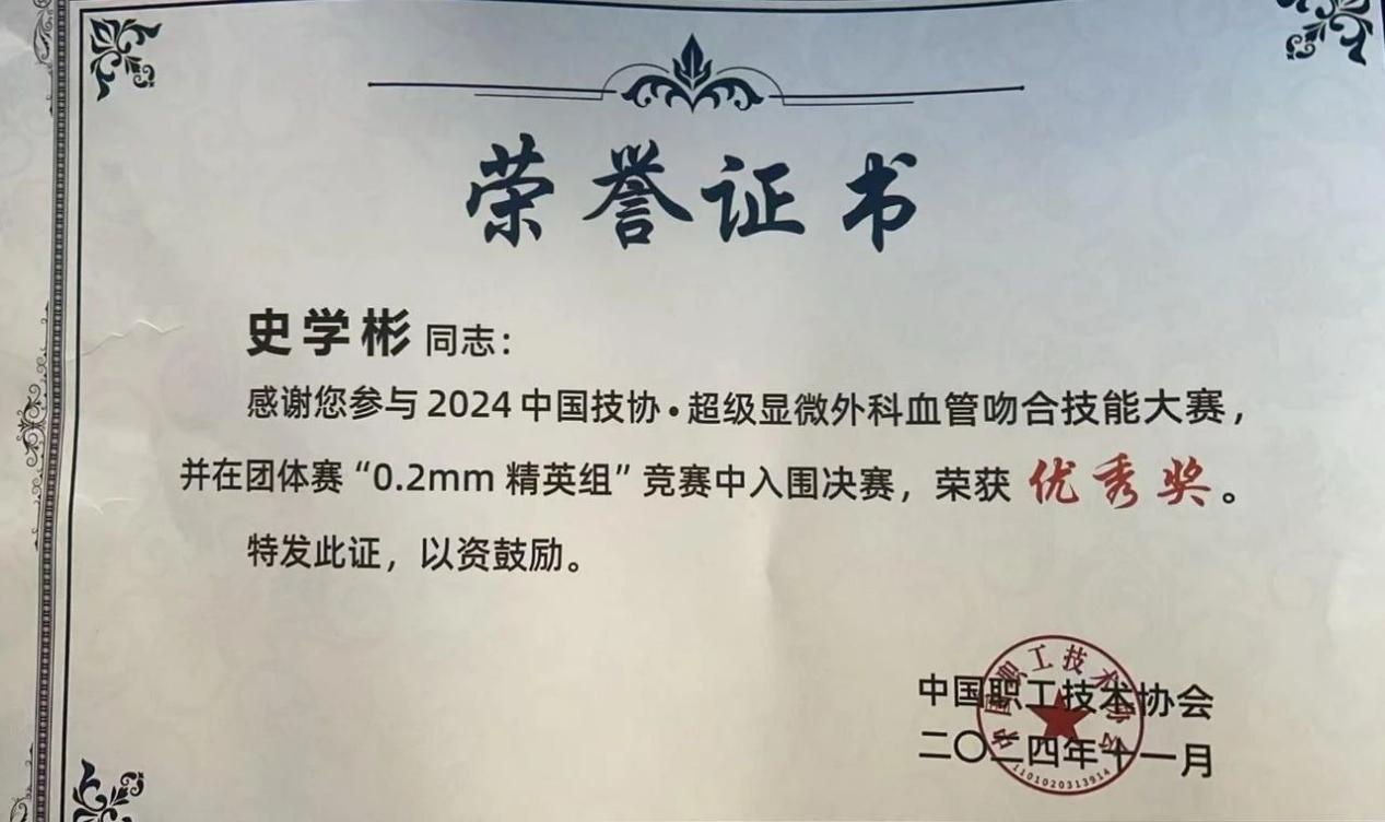 2024年10月31日至11月3日,备受瞩目的2024中国技协·超级显微外科血管吻合技能大赛在郑州隆重开幕。在这场盛大的赛事中,我院选派了技术精湛的手足外科医师吴碧龙和史学彬,他们凭借卓越的技艺和沉稳的心态,成功晋级决赛并斩获佳绩!