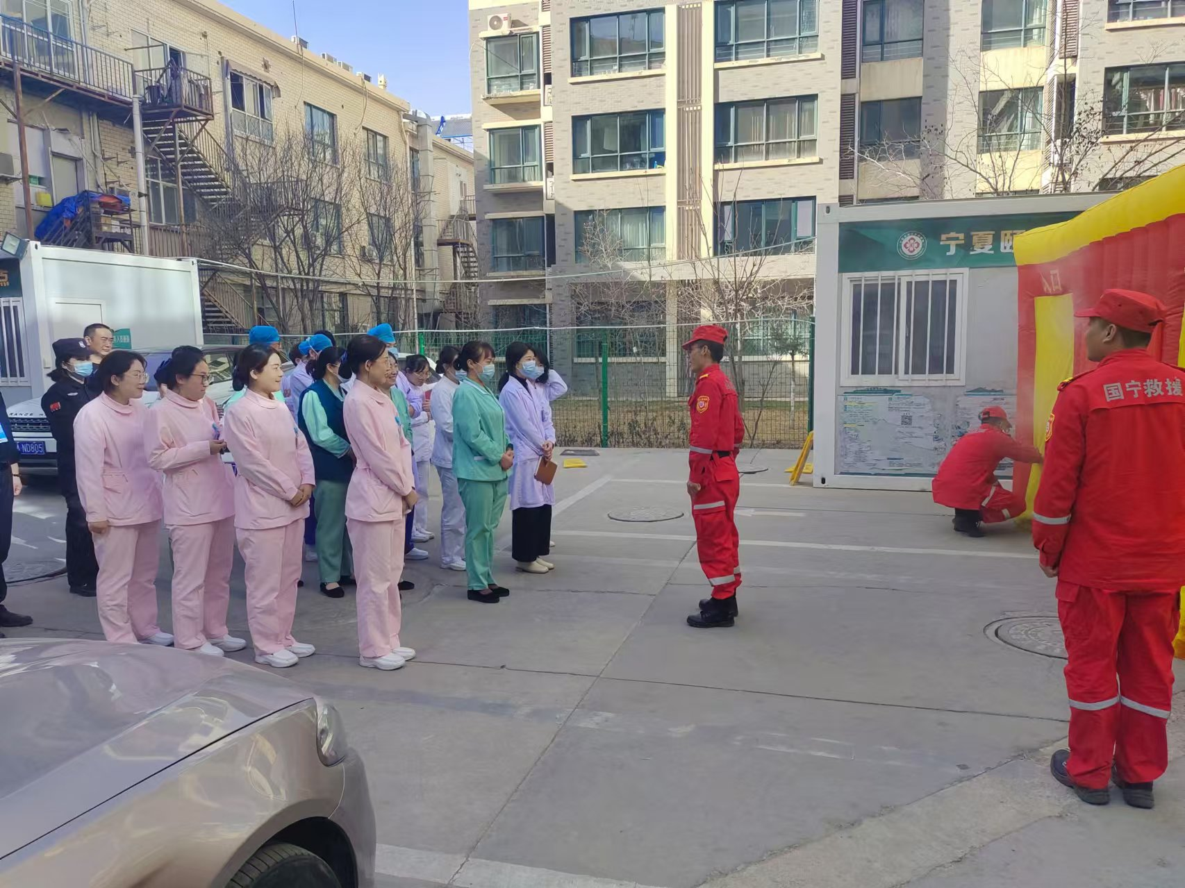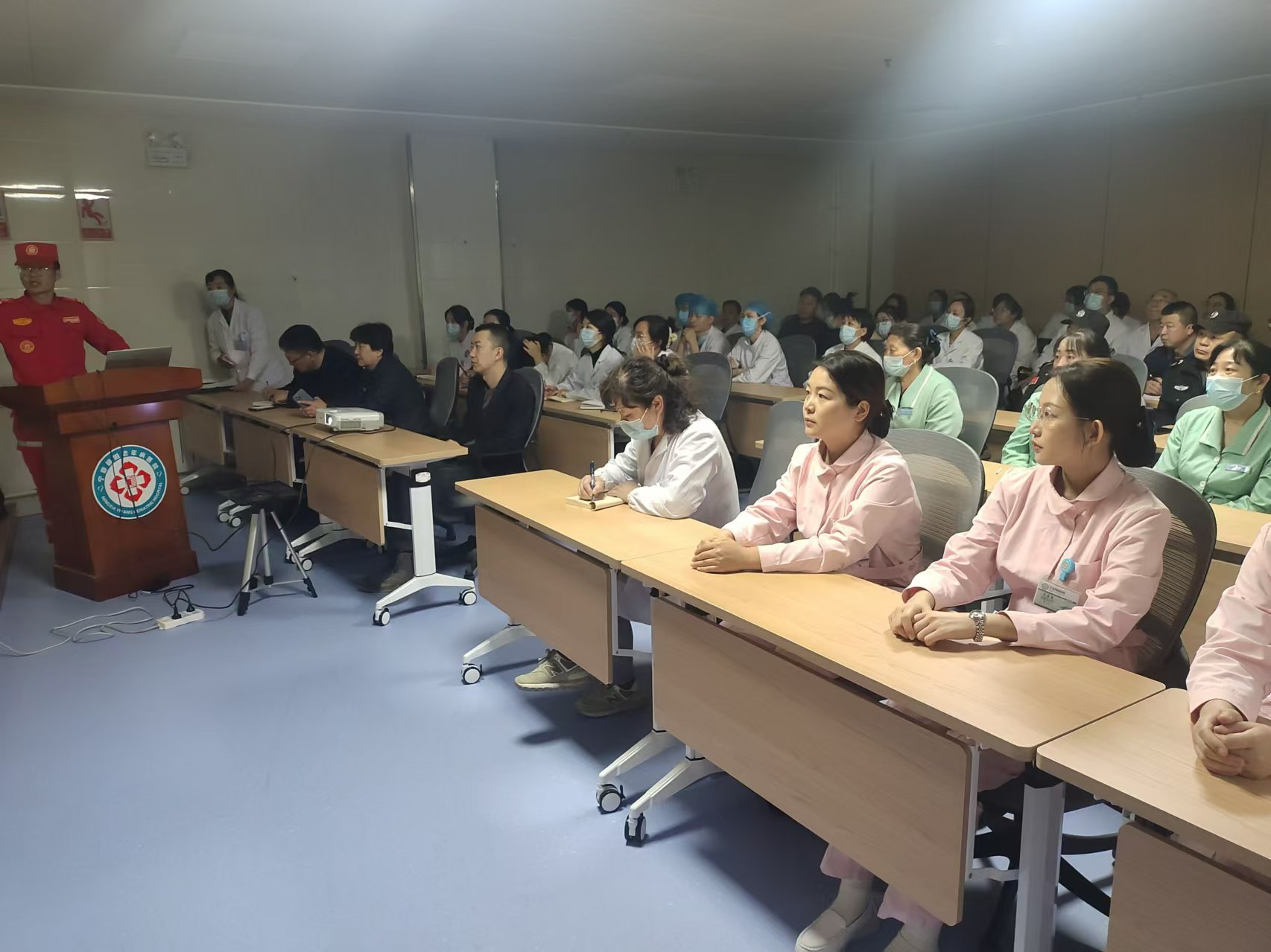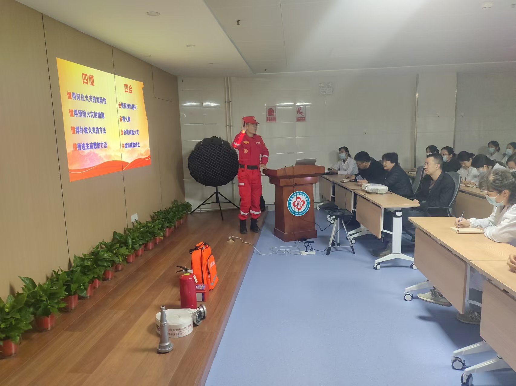活动伊始,国宁救援队教官结合医疗场所消防特点,通过典型案例剖析,系统讲解了医院火灾风险点、初期火灾扑救方法、疏散逃生路线规划及消防设施操作规范等内容。重点针对氧气设备、火源管控、病房电器使用、地震避险常识等高风险环节进行安全警示,强调"预防为主、防消结合"的消防安全理念。参训人员通过观看警示教育片、参与安全知识竞答的方式,进一步强化"隐患险于明火,防范胜于救灾"的责任意识。