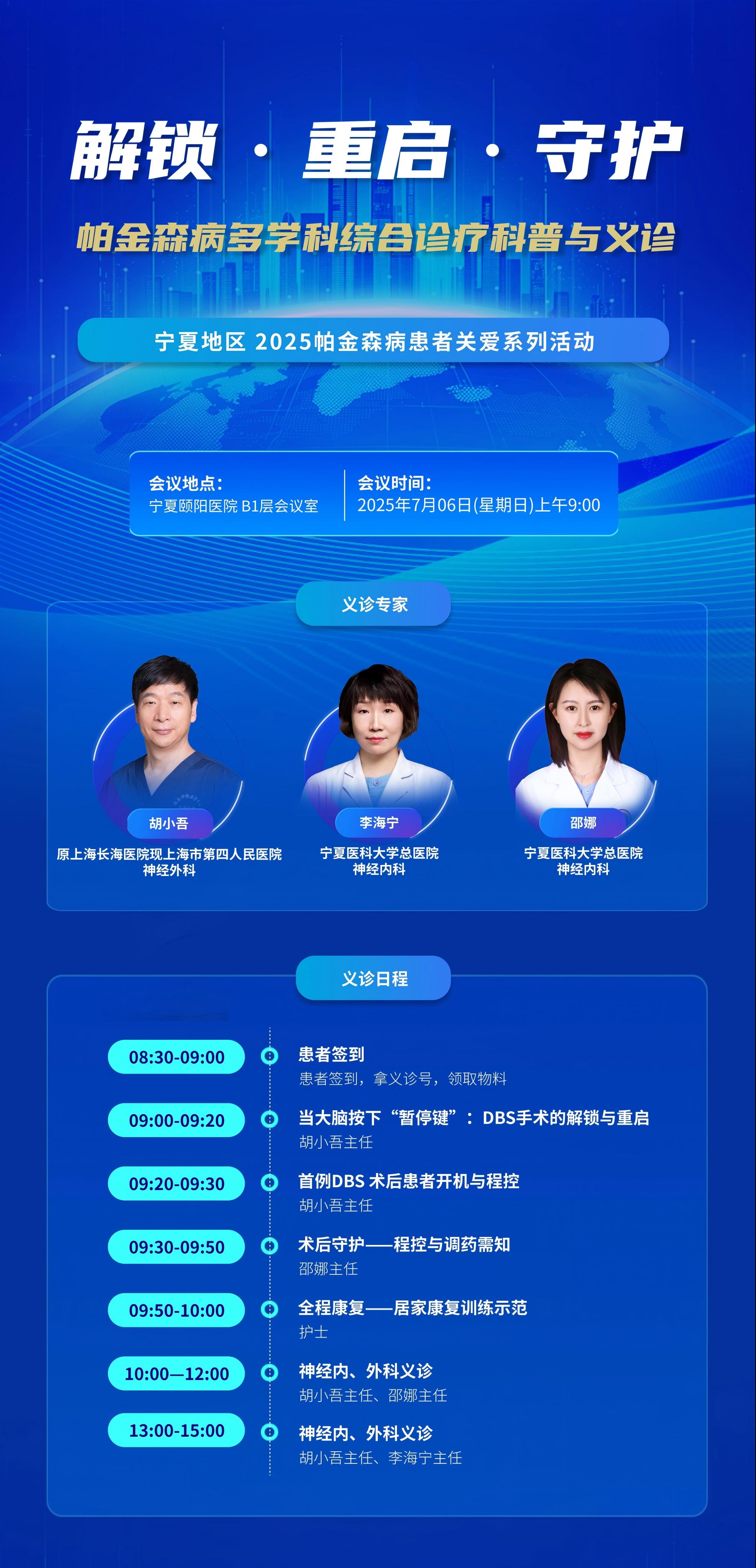 为深入贯彻落实国家卫生健康事业发展要求,进一步提升我院医疗服务质量,宁夏地区2025年度帕金森病患者关爱系列活动于2025年7月6日周日全天在我院举办,特邀上海市第四人民医院神经外科主任医师胡小吾、宁夏医科大学总医院神经内科李海宁主任医师、宁夏医科大学总医院神经内科邵娜副主任医师,开展《帕金森病多学科综合诊疗科普与义诊》活动,现诚挚邀请您参与,共筑健康生活!