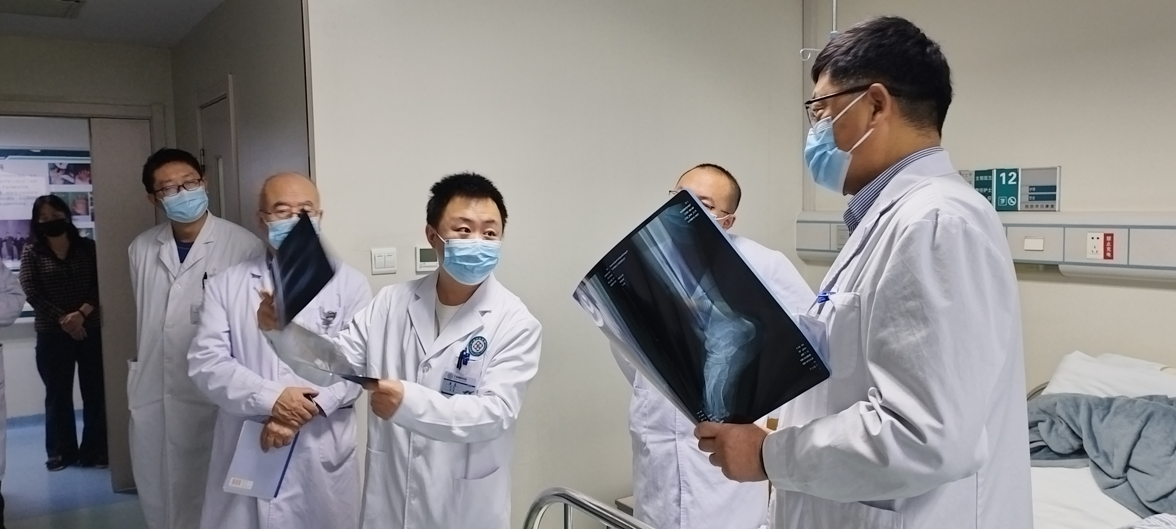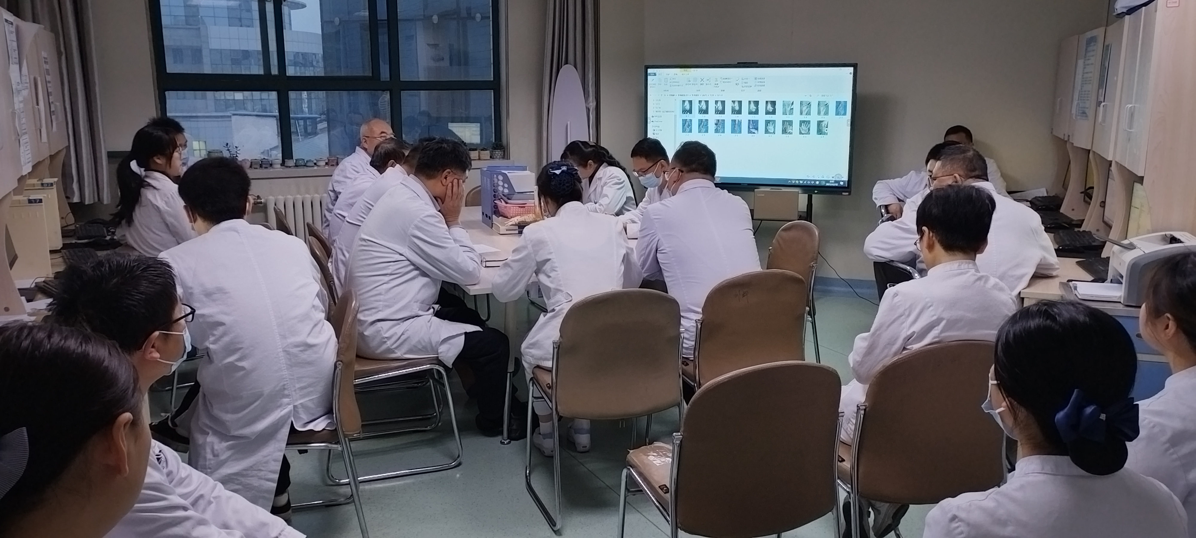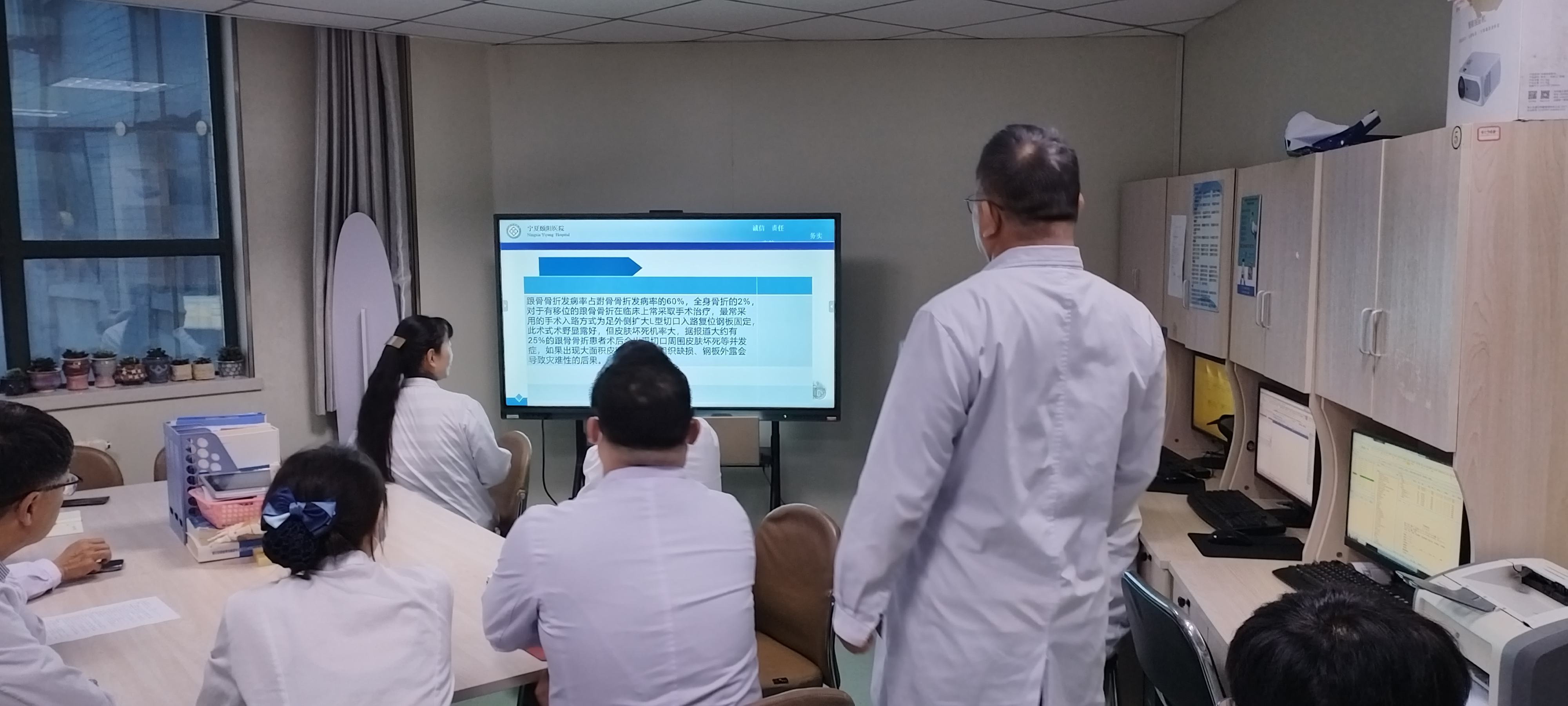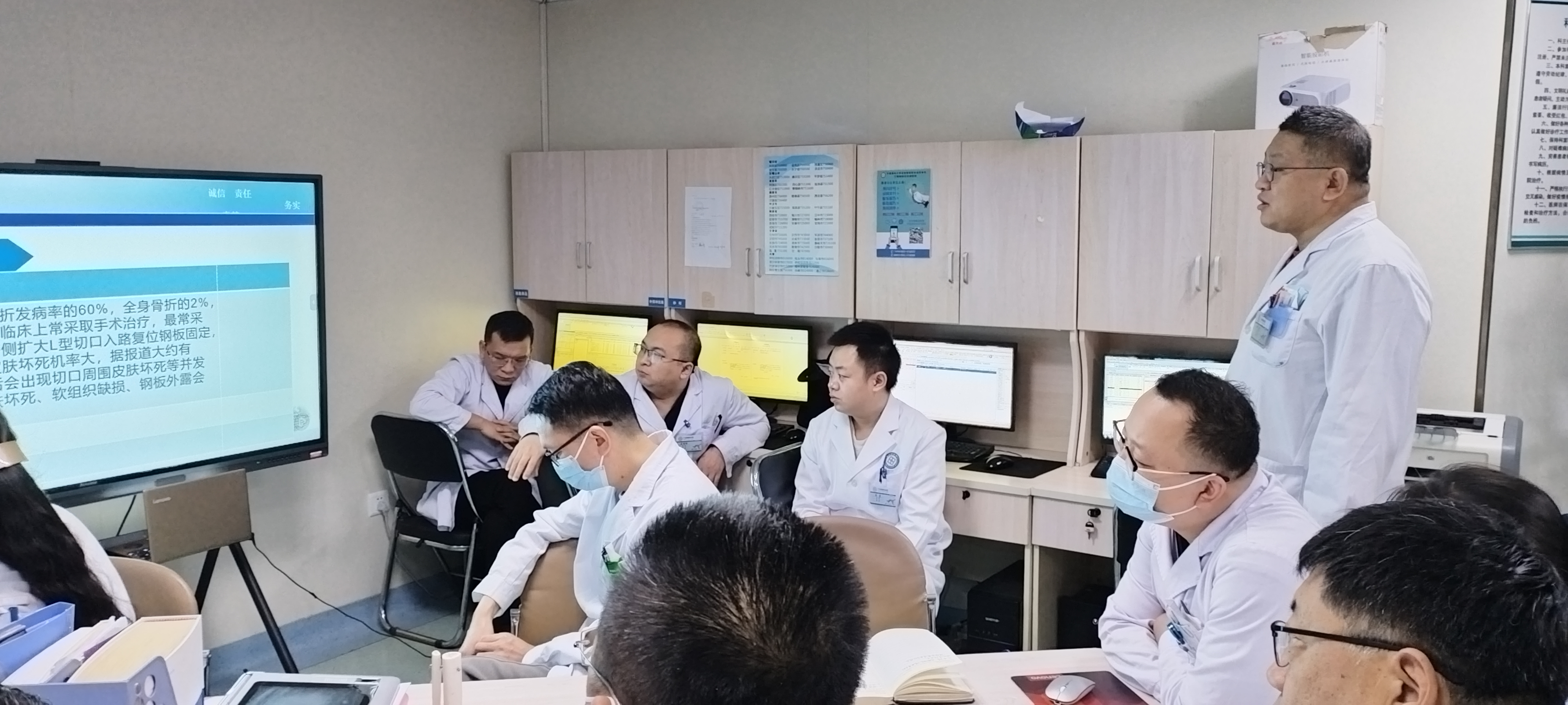 针对疑难危重病例,查房团队组织了集中讨论。在科室学习研讨环节,医护人员围绕跟骨骨折诊疗的临床难点、术后并发症防控等专业问题进行专题学习与交流。通过大屏幕详细调阅影像资料、化验结果,围绕“跟骨骨折”等具体疾病的发病机制、治疗新进展及个体化手术方案进行深入分析。这种以实际病例为引线的“现场教学”和“头脑风暴”,有效提升了年轻医生的临床决策能力。