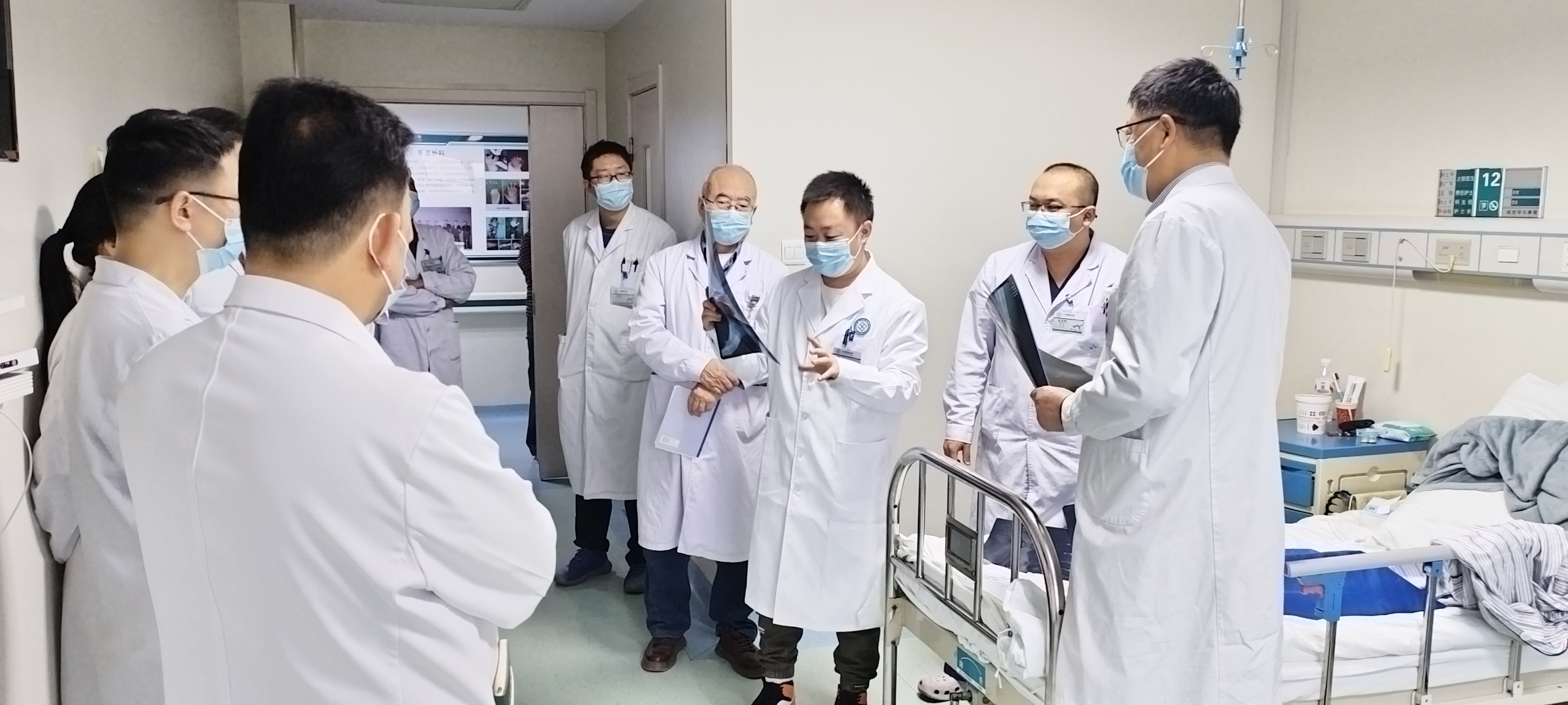 查房团队先后前往多个病区。在病房中,院长及专家们仔细查看患者影像资料,听取管床医生汇报,亲自进行专科查体,并就诊断依据、治疗方案、术后康复等关键环节与医护人员进行现场讨论。图片中,医护人员或围绕床旁,或聚焦于一张张CT、X光片,神情专注,展现了严谨的临床思维与团队协作精神。