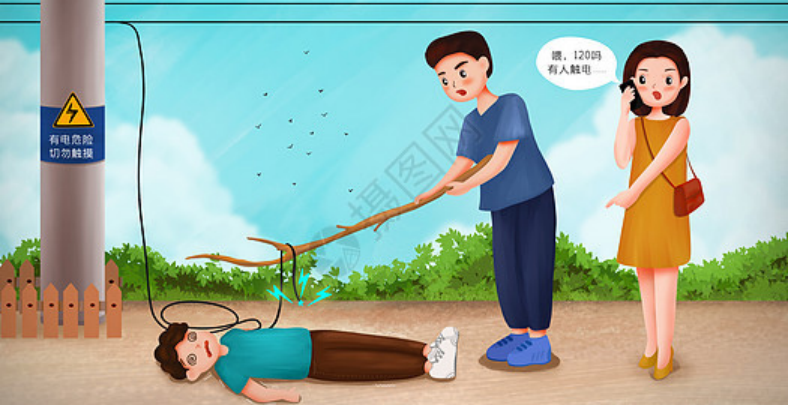 触电时,第一步是断电!切记不要用手直接去拉人,可以使用干燥的木棒、竹竿等绝缘物挑开电线,并拨打120。若伤者清醒,应让其就地平卧,避免站立或走动,以防继发性休克或心衰。如果伤者心脏骤停,则需要立即进行心肺复苏(参照心脏骤停急救)。